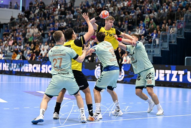Oli Mittun (IK Saevehof 78) gegen Miro Schluroff (VfL Gummersbach 15) und Stepan Zeman (VfL Gummersbach 66) Handball, EHF European Handball Federation, 2024-2025, Gruppenphase, Hinspiel, VfL Gummersbach (GER) vs. IK Saevehof (SWE), Schwalbe Arena Gummersbach, .08.10..2024 Foto: Eibner-Pressefoto/Juergen Augst |