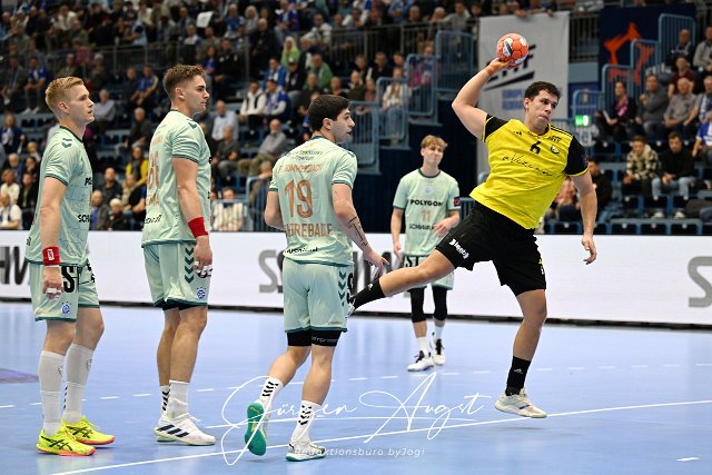 Adam Blanche (IK Saevehof 6) kommt am Kreis frei zum Abschluss Handball, EHF European Handball Federation, 2024-2025, Gruppenphase, Hinspiel, VfL Gummersbach (GER) vs. IK Saevehof (SWE), Schwalbe Arena Gummersbach, .08.10..2024 Foto: Eibner-Pressefoto/Juergen Augst |