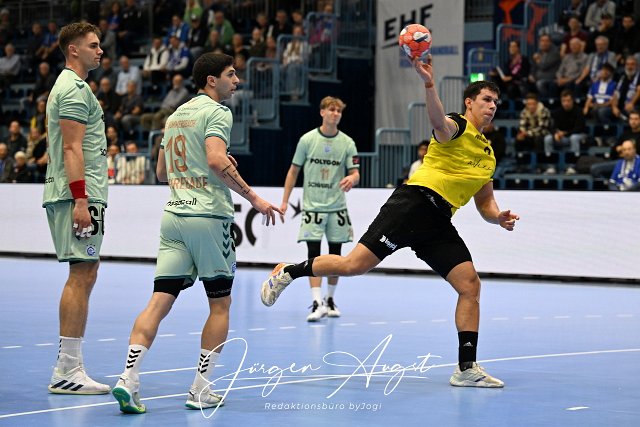 Adam Blanche (IK Saevehof 6) kommt am Kreis frei zum Abschluss Handball, EHF European Handball Federation, 2024-2025, Gruppenphase, Hinspiel, VfL Gummersbach (GER) vs. IK Saevehof (SWE), Schwalbe Arena Gummersbach, .08.10..2024 Foto: Eibner-Pressefoto/Juergen Augst |