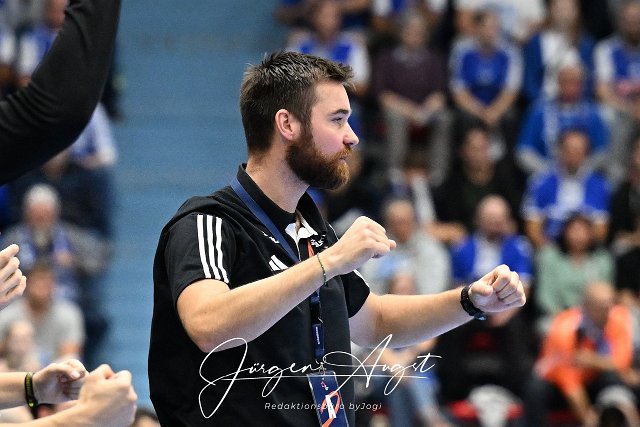 Linus Ekman (Co-Trainer IK Saevehof) mit geballten Faeusten Handball, EHF European Handball Federation, 2024-2025, Gruppenphase, Hinspiel, VfL Gummersbach (GER) vs. IK Saevehof (SWE), Schwalbe Arena Gummersbach, .08.10..2024 Foto: Eibner-Pressefoto/Juergen Augst |