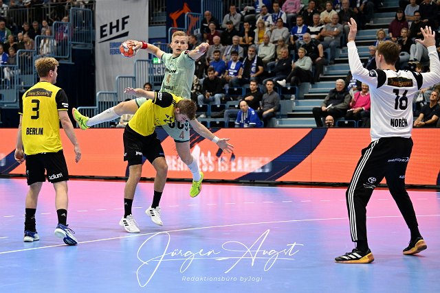 Ellidi Vidarsson (VfL Gummersbach 4) setzte den Schlusspunkt beim Sieg des VfL Gummersbach im EHF Pokal Heimspiel gegen die Mannschaf von IK Saevehof Handball, EHF European Handball Federation, 2024-2025, Gruppenphase, Hinspiel, VfL Gummersbach (GER) vs. IK Saevehof (SWE), Schwalbe Arena Gummersbach, .08.10..2024 Foto: Eibner-Pressefoto/Juergen Augst |