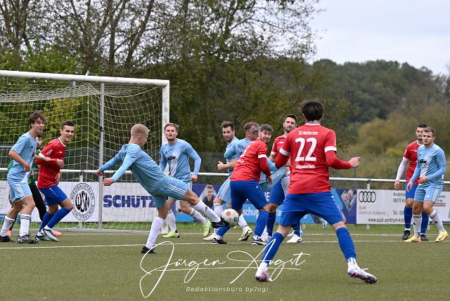 Fussball, Bezirksliga Ost, SG Neitersen-Altenkirchen (rot/blau) vs. FC HWW Niederrossbach (hellblau), 13.10.2024 |