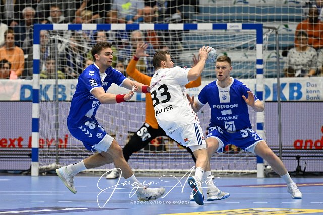 Moritz Sauter (Handball Sportverein Hamburg 33) gegen Stepan Zeman (VfL Gummersbach 66) und Kristjan Horzen (VfL Gummersbach 27 ) VfL Gummersbach vs. Handball Sportverein Handball, Daikin 1. Bundesliga, 9. Spieltag, Spielzeit 2024-2025, Schwalbe Arena Gummersbach, 03.11..2024 Foto: Eibner-Pressefoto/Juergen Augst |
