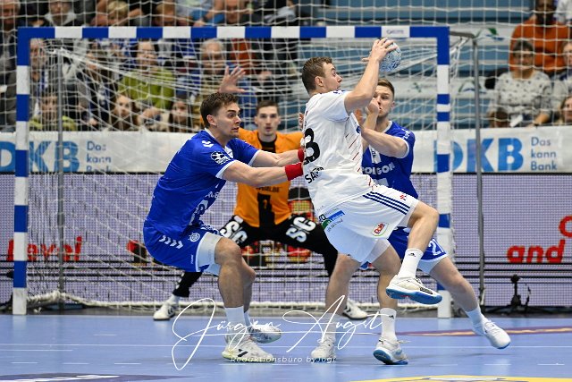 Moritz Sauter (Handball Sportverein Hamburg 33) gegen Stepan Zeman (VfL Gummersbach 66) und Kristjan Horzen (VfL Gummersbach 27 ) VfL Gummersbach vs. Handball Sportverein Handball, Daikin 1. Bundesliga, 9. Spieltag, Spielzeit 2024-2025, Schwalbe Arena Gummersbach, 03.11..2024 Foto: Eibner-Pressefoto/Juergen Augst |