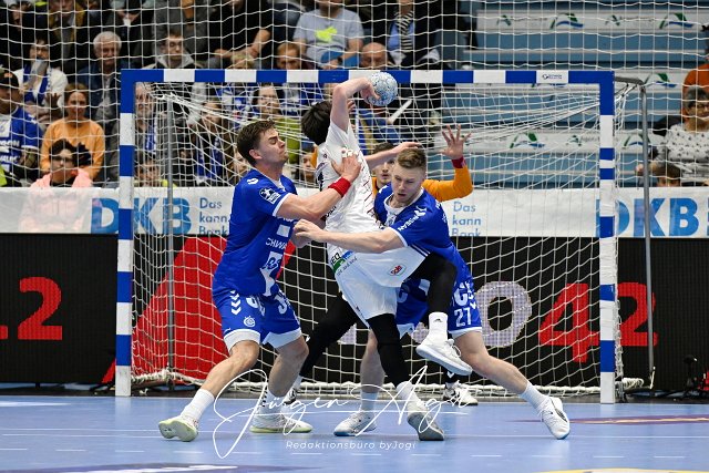 Leif Tissier (Handball Sportverein Hamburg 7) gegen Stepan Zeman (VfL Gummersbach 66) und Kristjan Horzen (VfL Gummersbach 27 ) VfL Gummersbach vs. Handball Sportverein Handball, Daikin 1. Bundesliga, 9. Spieltag, Spielzeit 2024-2025, Schwalbe Arena Gummersbach, 03.11..2024 Foto: Eibner-Pressefoto/Juergen Augst |