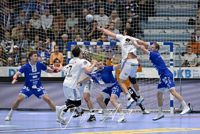 Jacob Arenth Lassen (Handball Sportverein Hamburg 9) gegenKristjan Horzen (VfL Gummersbach 27 ) und Tilen Kodrin (VfL Gummersbach 5) VfL Gummersbach vs. Handball Sportverein Handball, Daikin 1. Bundesliga, 9. Spieltag, Spielzeit 2024-2025, Schwalbe Arena Gummersbach, 03.11..2024 Foto: Eibner-Pressefoto/Juergen Augst |