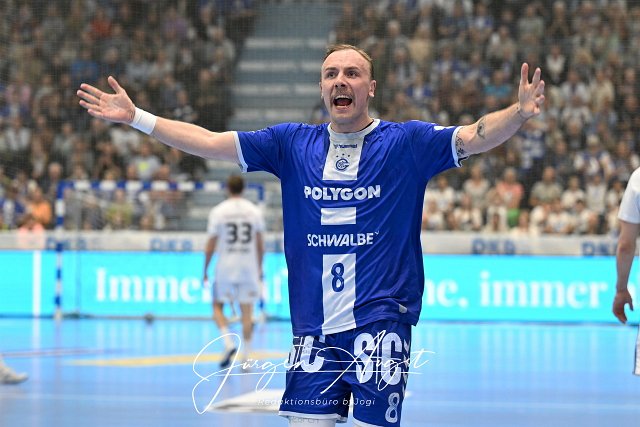 Lukas Blohme (VfL Gummersbach 8) jubelt mit ausgefreiteten Armen VfL Gummersbach vs. Handball Sport Verein Hamburg, Daikin 1. Bundesliga, 9. Spieltag, Spielzeit 2024-2025, Schwalbe Arena Gummersbach, 03.11.2024 Foto: Eibner-Pressefoto/Juergen Augst |