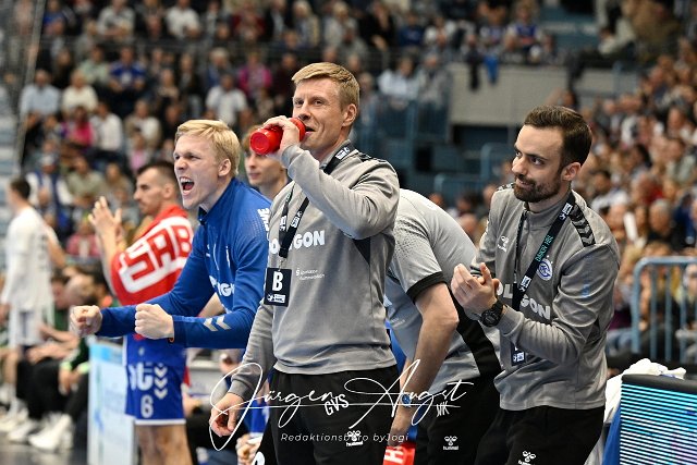 Gudjon Valur Sigurdsson (VfL Gummersbach Trainer) nimmt laechelnd einen Schluck aus der Pulle VfL Gummersbach vs. Handball Sport Verein Hamburg, Daikin 1. Bundesliga, 9. Spieltag, Spielzeit 2024-2025, Schwalbe Arena Gummersbach, 03.11.2024 Foto: Eibner-Pressefoto/Juergen Augst |