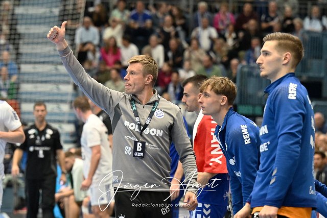 Gudjon Valur Sigurdsson (VfL Gummersbach Trainer) zeigt mit dem Daumen nach oben VfL Gummersbach vs. Handball Sport Verein Hamburg, Daikin 1. Bundesliga, 9. Spieltag, Spielzeit 2024-2025, Schwalbe Arena Gummersbach, 03.11.2024 Foto: Eibner-Pressefoto/Juergen Augst |