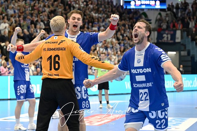 Bertram Obling (VfL Gummersbach 16), Stepan Zeman (VfL Gummersbach 66) und Kentin Mahe (VfL Gumersbach 22) bejubeln den Heimsieg gegen den HSV Hamburg VfL Gummersbach vs. Handball Sport Verein Hamburg, Daikin 1. Bundesliga, 9. Spieltag, Spielzeit 2024-2025, Schwalbe Arena Gummersbach, 03.11.2024 Foto: Eibner-Pressefoto/Juergen Augst |