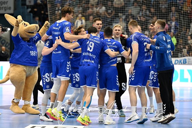 Jubel bei den Spielern des VfL Gummersbach ueber den Viertelfinaleinzug im DHB-Pokal GER, VfL Gummersbach vs. Bergischer HC, Handball, DHB-Pokal, Achtelfinale, Spielzeit 2024-2025, 14.11.2024 Foto: Eibner-Pressefoto/Juergen Augst |