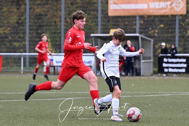 Fussball, Rheinlandliga C-Junioren, JSG Neitersen-Altenkirchen-Weyerbusch (rot) vs. SSV Heimbach-Weis (weiss/schwarz), 16.11.2024 |
