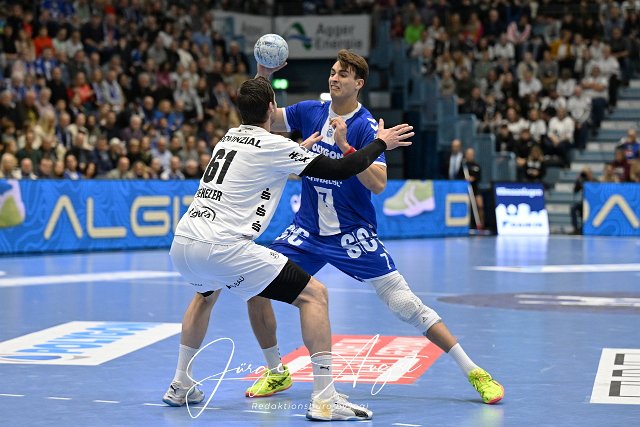 Julian Koester (VfL Gummersbach, #7) im Zweikampf mit Hendrik Pekeler (THW Kiel, #61) GER, VfL Gummersbach vs. THW Kiel, Handball, Daikin 1. Bundesliga, 11. Spieltag, Spielzeit 2024/25, 22.11.2024 Foto: Eibner-Pressefoto/Juergen Augst |