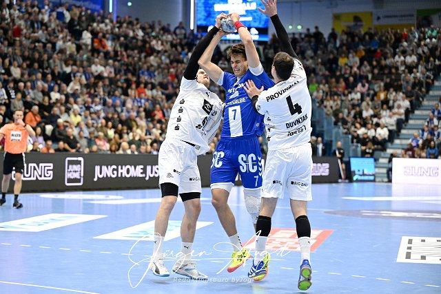 Julian Koester (VfL Gummersbach 7) gegen Hendrik Pekeler (THW Kiel 61) und Domagoj Duvnjak (THW Kiel 4) GER, VfL Gummersbach vs. THW Kiel, Handball, Daikin 1. Bundesliga, 11. Spieltag, Spielzeit 2024/25, 22.11.2024 Foto: Eibner-Pressefoto/Juergen Augst |