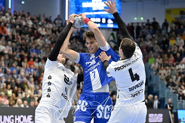 Julian Koester (VfL Gummersbach, #7) gegen Hendrik Pekeler (THW Kiel, #61) und Domagoj Duvnjak (THW Kiel, #4) GER, VfL Gummersbach vs. THW Kiel, Handball, Daikin 1. Bundesliga, 11. Spieltag, Spielzeit 2024/25, 22.11.2024 Foto: Eibner-Pressefoto/Juergen Augst |