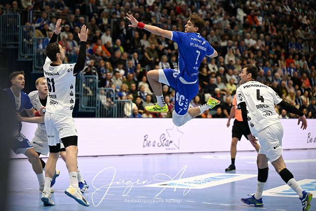 SpielernameJulian Koester (VfL Gummersbach 7) hat sich gegen Domagoj Duvnjak (THW Kiel 4) durchgesetzt und kommt zum Abschluss GER, VfL Gummersbach vs. THW Kiel, Handball, Daikin 1. Bundesliga, 11. Spieltag, Spielzeit 2024/25, 22.11.2024 Foto: Eibner-Pressefoto/Juergen Augst |