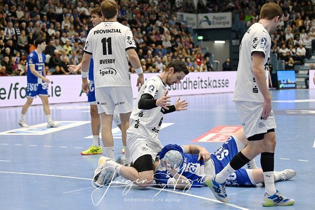 Hendrik Pekeler (THW Kiel, #61) hat Kristjan Horzen (VfL Gummersbach, #27) niedergestreckt GER, VfL Gummersbach vs. THW Kiel, Handball, Daikin 1. Bundesliga, 11. Spieltag, Spielzeit 2024/25, 22.11.2024 Foto: Eibner-Pressefoto/Juergen Augst |