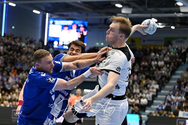 Julian Koester (VfL Gummersbach, #7) und Lukas Blohme (VfL Gummersbach, #8) stemmen sichn Eric Johansson (THW Kiel, #21) entgegen GER, VfL Gummersbach vs. THW Kiel, Handball, Daikin 1. Bundesliga, 11. Spieltag, Spielzeit 2024/25, 22.11.2024 Foto: Eibner-Pressefoto/Juergen Augst |