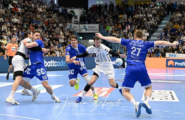Domagoj Duvnjak (THW Kiel, #4) gegen Julian Koester (VfL Gummersbach, #7) und Kristjan Horzen (VfL Gummersbach, #27) GER, VfL Gummersbach vs. THW Kiel, Handball, Daikin 1. Bundesliga, 11. Spieltag, Spielzeit 2024/25, 22.11.2024 Foto: Eibner-Pressefoto/Juergen Augst |