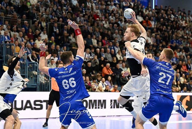 Eric Johansson (THW Kiel 21) gegenKristjan Horzen (VfL Gummersbach 27 ) GER, VfL Gummersbach vs. THW Kiel, Handball, Daikin 1. Bundesliga, 11. Spieltag, Spielzeit 2024/25, 22.11.2024 Foto: Eibner-Pressefoto/Juergen Augst |