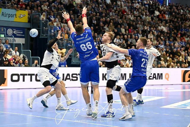 Eric Johansson (THW Kiel 21) gegen Kristjan Horzen (VfL Gummersbach 27 ) und Stepan Zeman (VfL Gummersbach 66) GER, VfL Gummersbach vs. THW Kiel, Handball, Daikin 1. Bundesliga, 11. Spieltag, Spielzeit 2024/25, 22.11.2024 Foto: Eibner-Pressefoto/Juergen Augst |