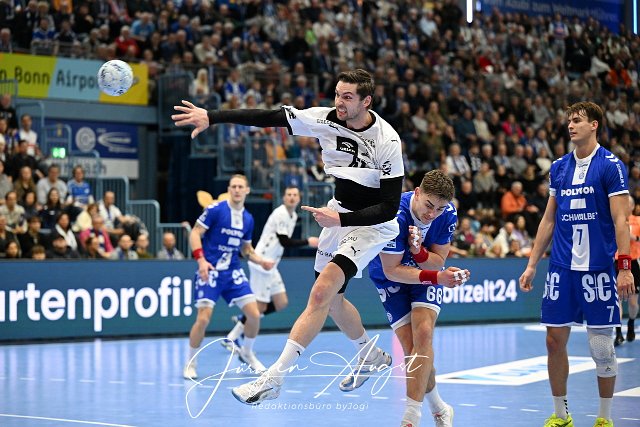 Hendrik Pekeler (THW Kiel 61) hat sich gegen Stepan Zeman (VfL Gummersbach 66) durchgesetzt und wirft GER, VfL Gummersbach vs. THW Kiel, Handball, Daikin 1. Bundesliga, 11. Spieltag, Spielzeit 2024/25, 22.11.2024 Foto: Eibner-Pressefoto/Juergen Augst |