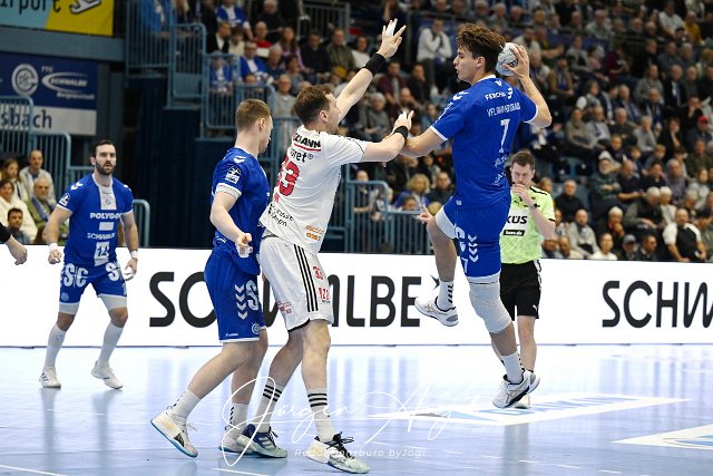 Julian Koester (VfL Gummersbach, #7) gegen Nikolai Link (HC Erlangen, #33) VfL Gummersbach vs. HC Erlangen, Handball, Daikin 1. Bundesliga, 13. Spieltag, Spielzeit 2024-2025, Schwalbe Arena Gummersbach, 08.12.2024 Foto: Eibner-Pressefoto/Juergen Augst |