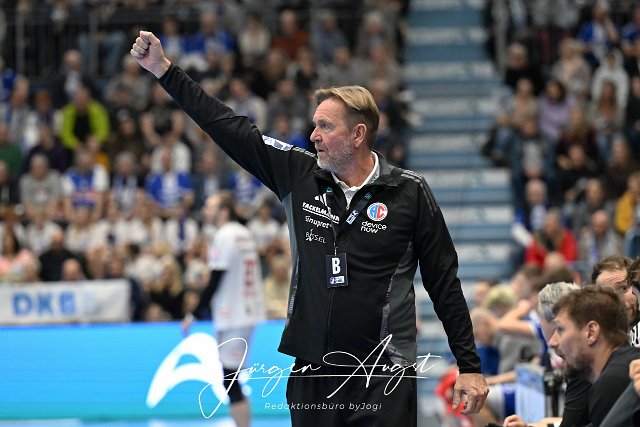 Martin Schwalb (HC Erlangen, Trainer) mit erhobener Faust VfL Gummersbach vs. HC Erlangen, Handball, Daikin 1. Bundesliga, 13. Spieltag, Spielzeit 2024-2025, Schwalbe Arena Gummersbach, 08.12.2024 Foto: Eibner-Pressefoto/Juergen Augst |