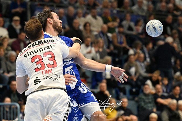 Teitur Einarsson (VfL Gummersbach, #14) gegen Nikolai Link (HC Erlangen, #33) VfL Gummersbach vs. HC Erlangen, Handball, Daikin 1. Bundesliga, 13. Spieltag, Spielzeit 2024-2025, Schwalbe Arena Gummersbach, 08.12.2024 Foto: Eibner-Pressefoto/Juergen Augst |