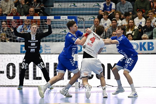 Stephan Seitz (HC Erlangen, #4) gegen Stepan Zeman (VfL Gummersbach, #66) und Miro Schluroff (VfL Gummersbach, #15) VfL Gummersbach vs. HC Erlangen, Handball, Daikin 1. Bundesliga, 13. Spieltag, Spielzeit 2024-2025, Schwalbe Arena Gummersbach, 08.12.2024 Foto: Eibner-Pressefoto/Juergen Augst |