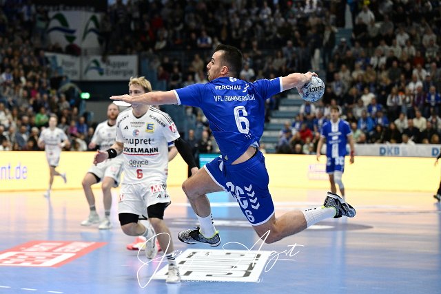 Milos Vujovic (VfL Gummersbach 6) beim Tempogegenstoss VfL Gummersbach vs. HC Erlangen, Handball, Daikin 1. Bundesliga, 13. Spieltag, Spielzeit 2024-2025, Schwalbe Arena Gummersbach, 08.12.2024 Foto: Eibner-Pressefoto/Juergen Augst |