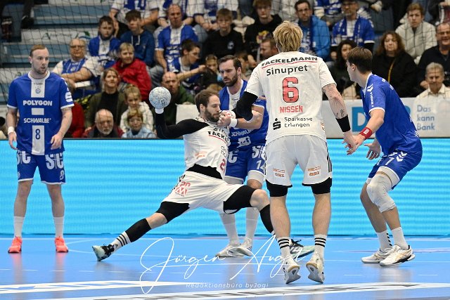 Nico Buedel (HC Erlangen, #20) gegen Teitur Einarsson (VfL Gummersbach, #14) VfL Gummersbach vs. HC Erlangen, Handball, Daikin 1. Bundesliga, 13. Spieltag, Spielzeit 2024-2025, Schwalbe Arena Gummersbach, 08.12.2024 Foto: Eibner-Pressefoto/Juergen Augst |