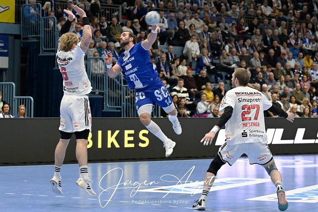 Teitur Einarsson (VfL Gummersbach 14) gegen Marek Nissen (HC Erlangen, #6) VfL Gummersbach vs. HC Erlangen, Handball, Daikin 1. Bundesliga, 13. Spieltag, Spielzeit 2024-2025, Schwalbe Arena Gummersbach, 08.12.2024 Foto: Eibner-Pressefoto/Juergen Augst |