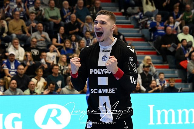 Dominik Kuzmanovic (VfL Gummersbach 1) jubelt mit geballten Faeusten VfL Gummersbach vs. HC Erlangen, Handball, Daikin 1. Bundesliga, 13. Spieltag, Spielzeit 2024-2025, Schwalbe Arena Gummersbach, 08.12.2024 Foto: Eibner-Pressefoto/Juergen Augst |