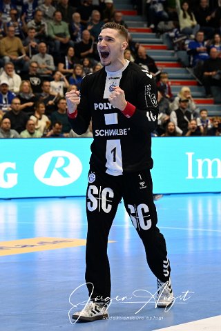 Dominik Kuzmanovic (VfL Gummersbach, #1) jubelt VfL Gummersbach vs. HC Erlangen, Handball, Daikin 1. Bundesliga, 13. Spieltag, Spielzeit 2024-2025, Schwalbe Arena Gummersbach, 08.12.2024 Foto: Eibner-Pressefoto/Juergen Augst |