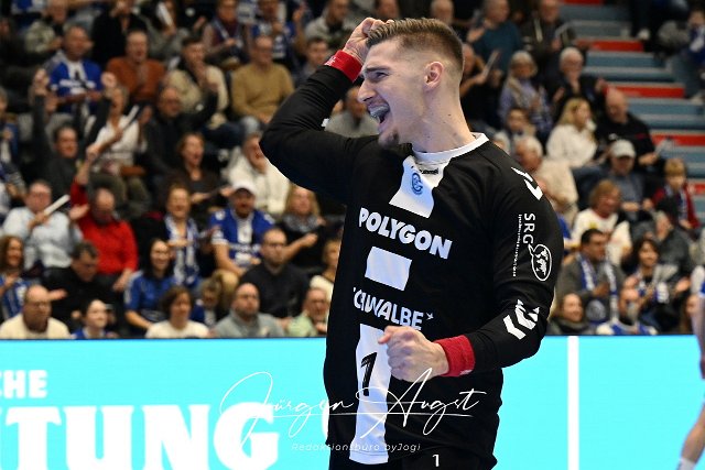 Dominik Kuzmanovic (VfL Gummersbach, #1) jubelt VfL Gummersbach vs. HC Erlangen, Handball, Daikin 1. Bundesliga, 13. Spieltag, Spielzeit 2024-2025, Schwalbe Arena Gummersbach, 08.12.2024 Foto: Eibner-Pressefoto/Juergen Augst |