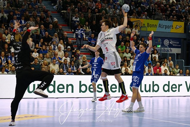 Tim Goemmel (HC Erlangen, #95) gegen Dominik Kuzmanovic (VfL Gummersbach, #1) VfL Gummersbach vs. HC Erlangen, Handball, Daikin 1. Bundesliga, 13. Spieltag, Spielzeit 2024-2025, Schwalbe Arena Gummersbach, 08.12.2024 Foto: Eibner-Pressefoto/Juergen Augst |