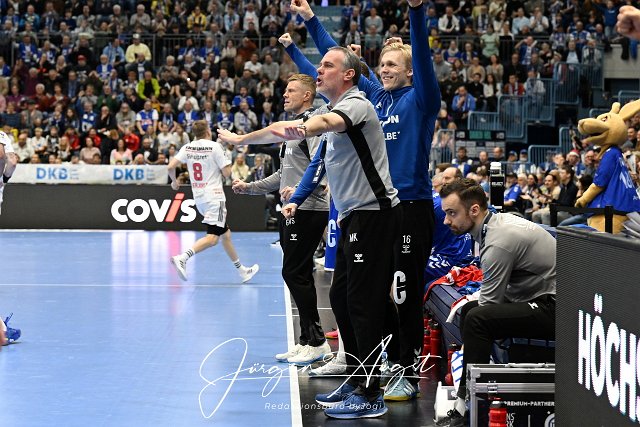 Die Gummersbacher Bank jubelt VfL Gummersbach vs. HC Erlangen, Handball, Daikin 1. Bundesliga, 13. Spieltag, Spielzeit 2024-2025, Schwalbe Arena Gummersbach, 08.12.2024 Foto: Eibner-Pressefoto/Juergen Augst |