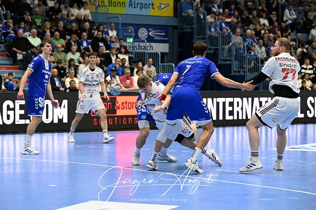 Sander Overjordet (HC Erlangen, #8) gegen Stepan Zeman (VfL Gummersbach, #66) und Julian Koester (VfL Gummersbach, #7) VfL Gummersbach vs. HC Erlangen, Handball, Daikin 1. Bundesliga, 13. Spieltag, Spielzeit 2024-2025, Schwalbe Arena Gummersbach, 08.12.2024 Foto: Eibner-Pressefoto/Juergen Augst |