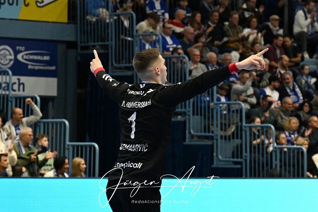 Dominik Kuzmanovic (VfL Gummersbach 1) jubelt VfL Gummersbach vs. HC Erlangen, Handball, Daikin 1. Bundesliga, 13. Spieltag, Spielzeit 2024-2025, Schwalbe Arena Gummersbach, 08.12.2024 Foto: Eibner-Pressefoto/Juergen Augst |