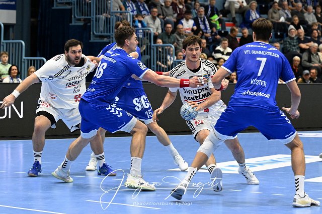Stephan Seitz (HC Erlangen, #4) gegen Stepan Zeman (VfL Gummersbach, #66) und Julian Koester (VfL Gummersbach, #7) VfL Gummersbach vs. HC Erlangen, Handball, Daikin 1. Bundesliga, 13. Spieltag, Spielzeit 2024-2025, Schwalbe Arena Gummersbach, 08.12.2024 Foto: Eibner-Pressefoto/Juergen Augst |