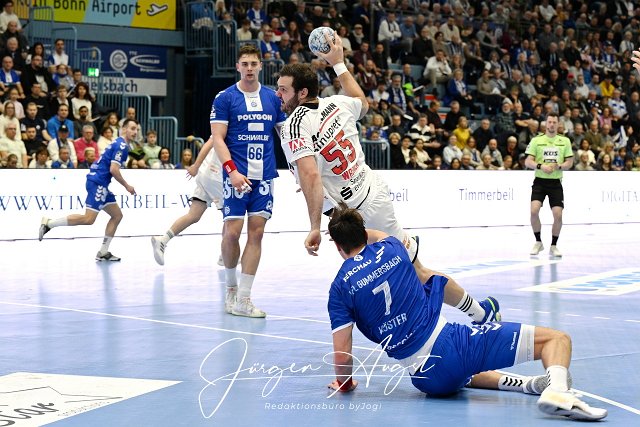 Tobias Wagner (HC Erlangen, #55) gegen Julian Koester (VfL Gummersbach 7) VfL Gummersbach vs. HC Erlangen, Handball, Daikin 1. Bundesliga, 13. Spieltag, Spielzeit 2024-2025, Schwalbe Arena Gummersbach, 08.12.2024 Foto: Eibner-Pressefoto/Juergen Augst |