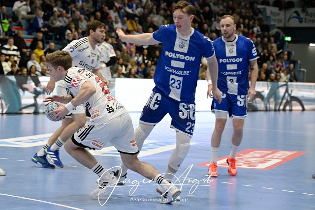 Christopher Bissel (HC Erlangen, #21) gegen Ole Pregler (VfL Gummersbach, #23) VfL Gummersbach vs. HC Erlangen, Handball, Daikin 1. Bundesliga, 13. Spieltag, Spielzeit 2024-2025, Schwalbe Arena Gummersbach, 08.12.2024 Foto: Eibner-Pressefoto/Juergen Augst |