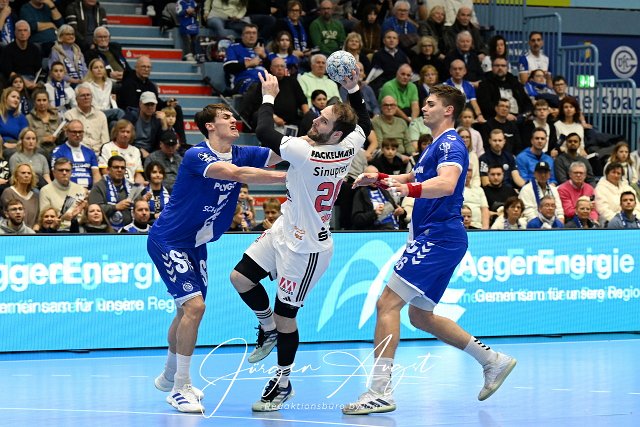 Nico Buedel (HC Erlangen, #20) gegen Miro Schluroff (VfL Gummersbach 15) und Stepan Zeman (VfL Gummersbach 66) VfL Gummersbach vs. HC Erlangen, Handball, Daikin 1. Bundesliga, 13. Spieltag, Spielzeit 2024-2025, Schwalbe Arena Gummersbach, 08.12.2024 Foto: Eibner-Pressefoto/Juergen Augst |