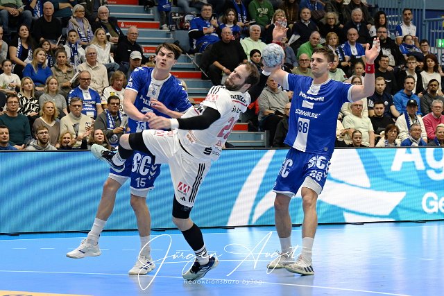 Nico Buedel (HC Erlangen, #20) hat sich gegen Miro Schluroff (VfL Gummersbach 15) und Stepan Zeman (VfL Gummersbach 66) durchsetzt und kommt zum Abschluss VfL Gummersbach vs. HC Erlangen, Handball, Daikin 1. Bundesliga, 13. Spieltag, Spielzeit 2024-2025, Schwalbe Arena Gummersbach, 08.12.2024 Foto: Eibner-Pressefoto/Juergen Augst |