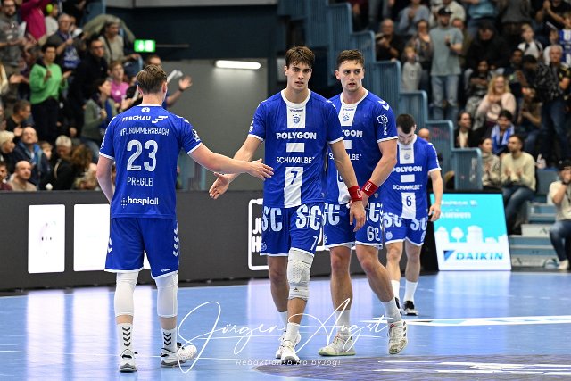 Julian Koester (VfL Gummersbach, #7) und Ole Pregler (VfL Gummersbach, #23) klatschen nach dem Sieg gegen Erlangen ab VfL Gummersbach vs. HC Erlangen, Handball, Daikin 1. Bundesliga, 13. Spieltag, Spielzeit 2024-2025, Schwalbe Arena Gummersbach, 08.12.2024 Foto: Eibner-Pressefoto/Juergen Augst |