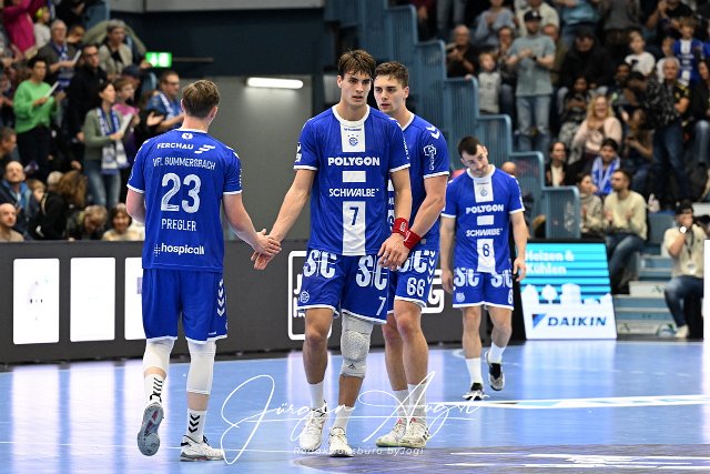 Julian Koester (VfL Gummersbach, #7) und Ole Pregler (VfL Gummersbach, #23) klatschen nach dem Sieg gegen Erlangen ab VfL Gummersbach vs. HC Erlangen, Handball, Daikin 1. Bundesliga, 13. Spieltag, Spielzeit 2024-2025, Schwalbe Arena Gummersbach, 08.12.2024 Foto: Eibner-Pressefoto/Juergen Augst |