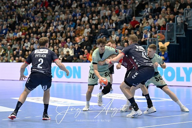Julian Koester (VfL Gummersbach, 7) gegen #43 Blaz Blagotinsek (SG Flensburg-Handewitt 43) und Johannes Golla (SG Flensburg-Handewitt 4) VfL Gummersbach vs. SG Flensburg-Handewitt, Handball, EHF Pokal, Hauptrunde, Spielzeit 2024-2025, Schwalbe Arena Gummersbach, 11.02.2025 Foto: Eibner-Pressefoto/Juergen Augst |