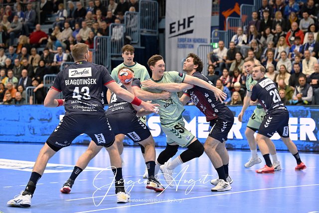 Ole Pregler (VfL Gummersbach, 23) gegen Niclas Kirkeloekke (SG Flensburg-Handewitt 5), Johannes Golla (SG Flensburg-Handewitt 4) und #43 Blaz Blagotinsek (SG Flensburg-Handewitt 43) VfL Gummersbach vs. SG Flensburg-Handewitt, Handball, EHF Pokal, Hauptrunde, Spielzeit 2024-2025, Schwalbe Arena Gummersbach, 11.02.2025 Foto: Eibner-Pressefoto/Juergen Augst |