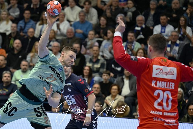 Kristjan Horzen (VfL Gummersbach, 27) gegen Kevin Moller (SG Flensburg-Handewitt 20) VfL Gummersbach vs. SG Flensburg-Handewitt, Handball, EHF Pokal, Hauptrunde, Spielzeit 2024-2025, Schwalbe Arena Gummersbach, 11.02.2025 Foto: Eibner-Pressefoto/Juergen Augst |